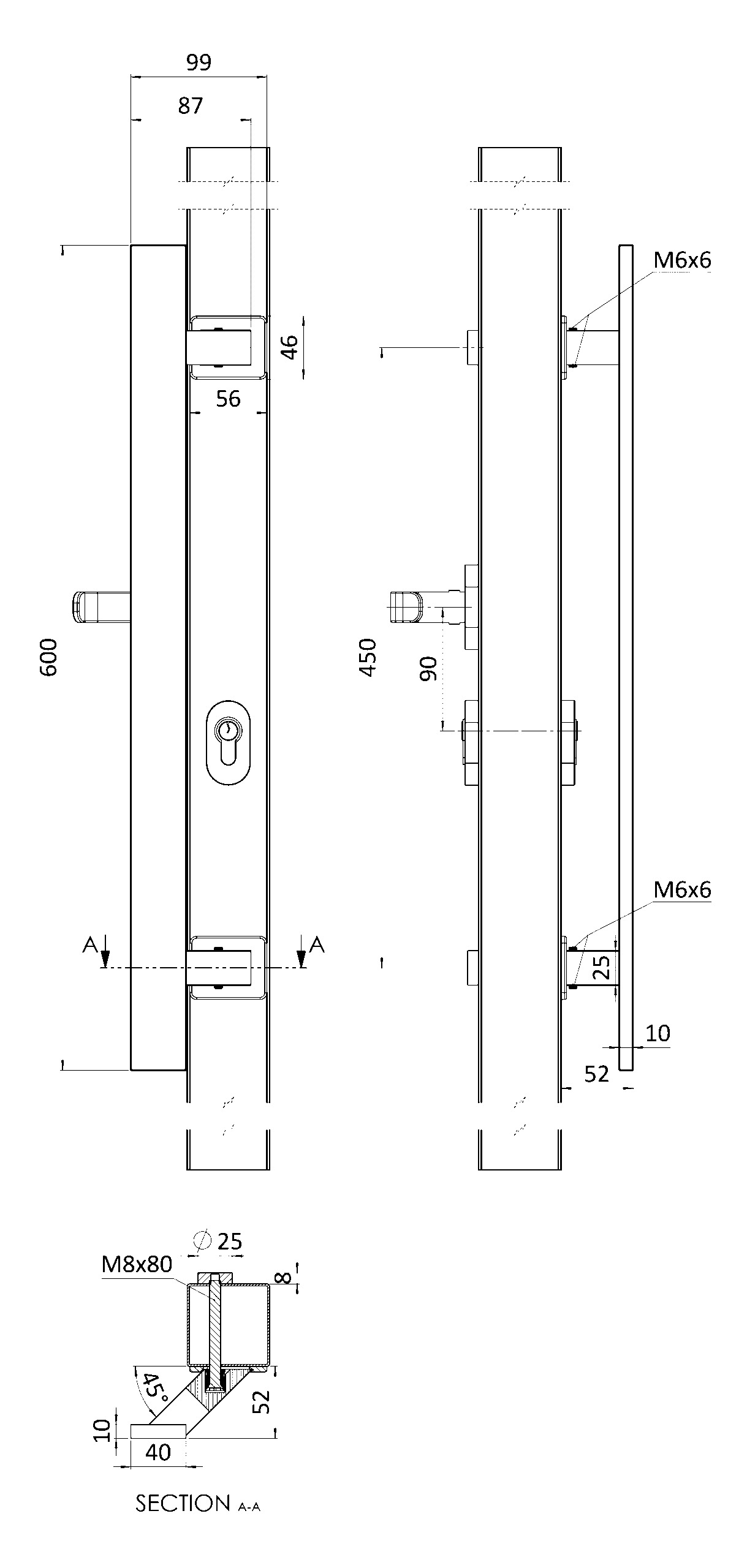 Svorka skla na skleněný dveřní systém, mezi sklo a sklo 90°, 45x45mm, tloušťka skla 8-10mm,