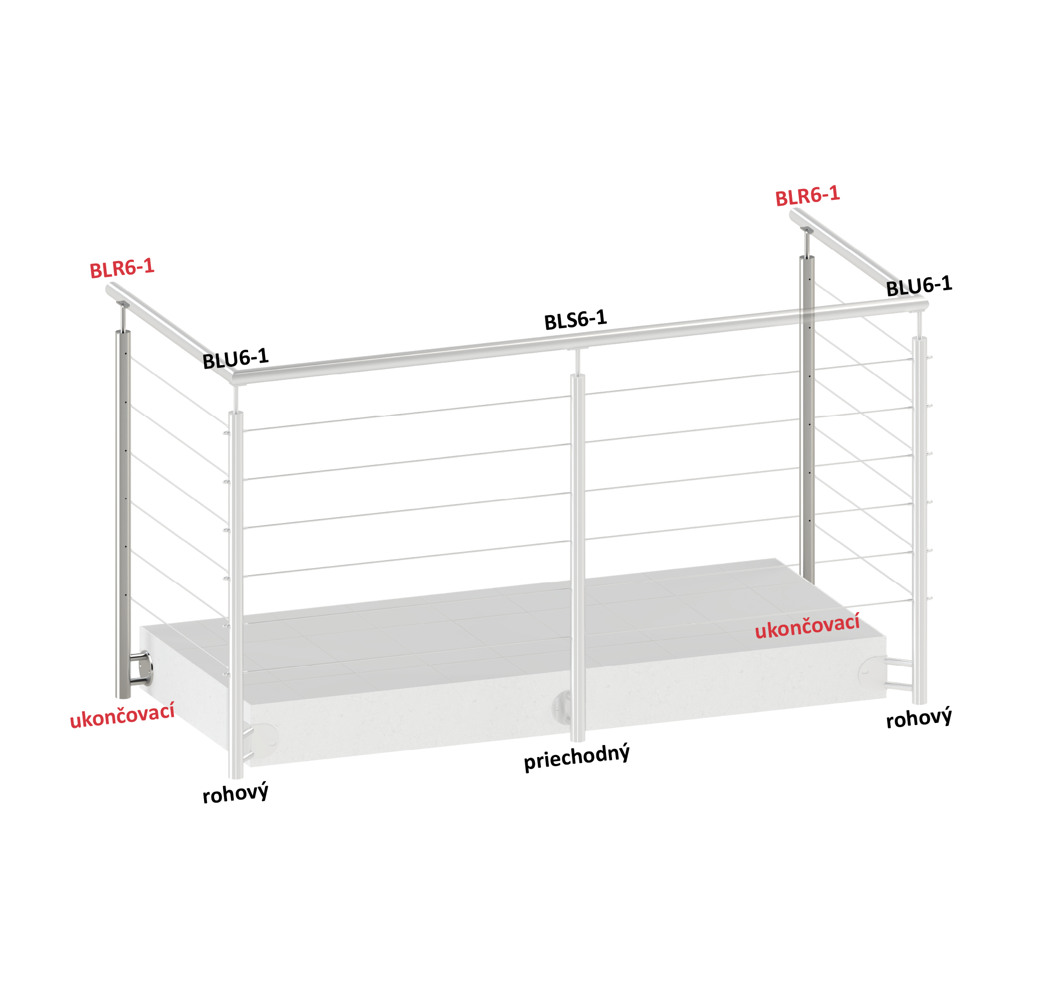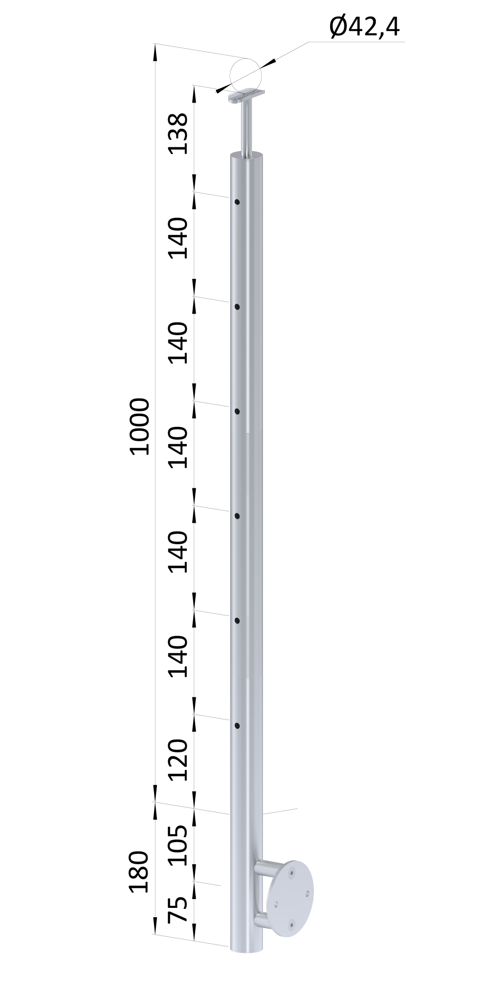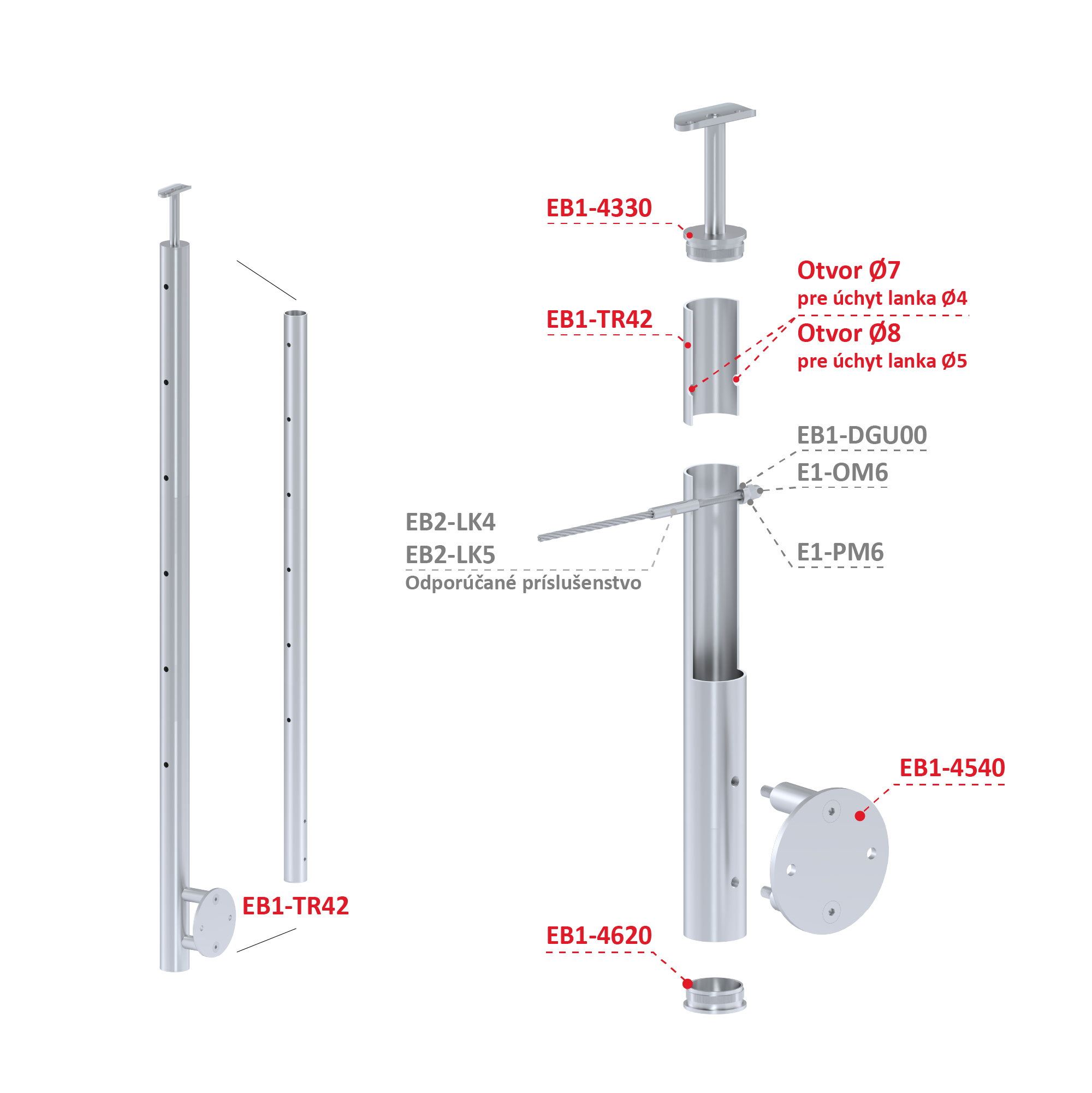 Nerezový sloup, boční kotvení, 6děrový, lanko, koncový