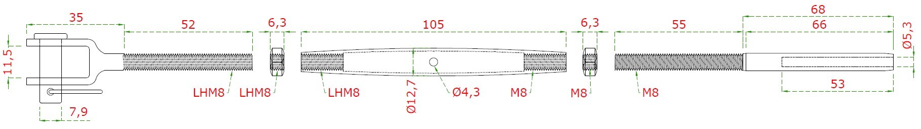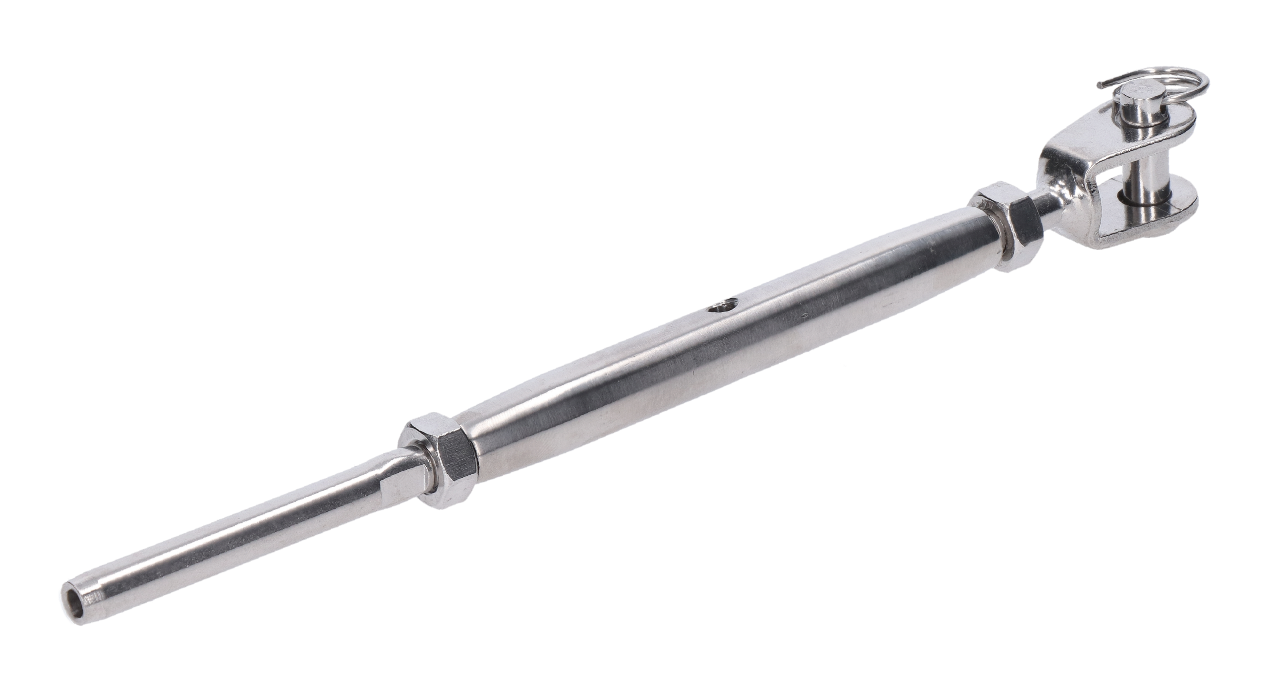 Lepicí úchyt, šponovák pro nerezové lanko ø5 mm, se závitem M8 a LH8, broušená nerez K320 / AISI304